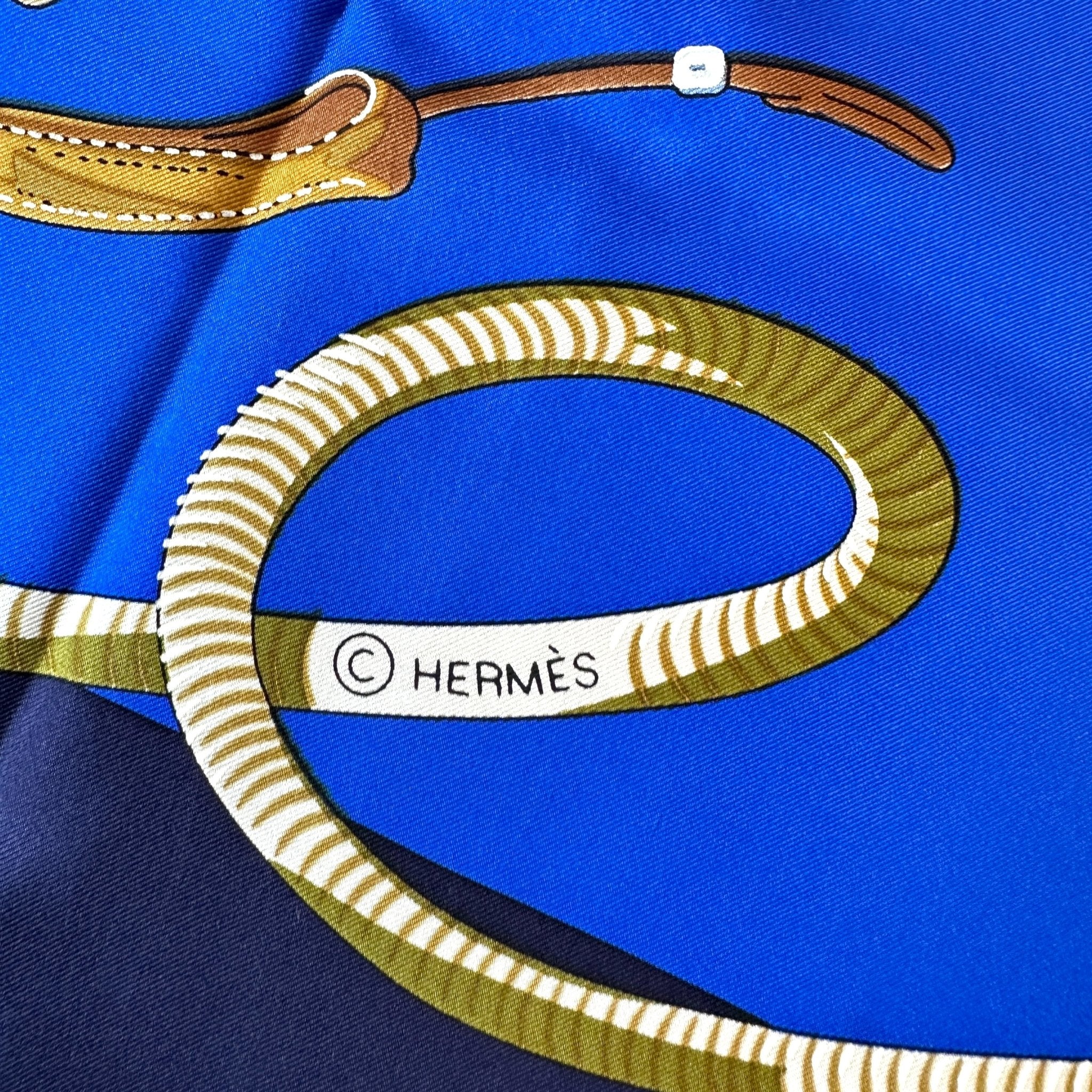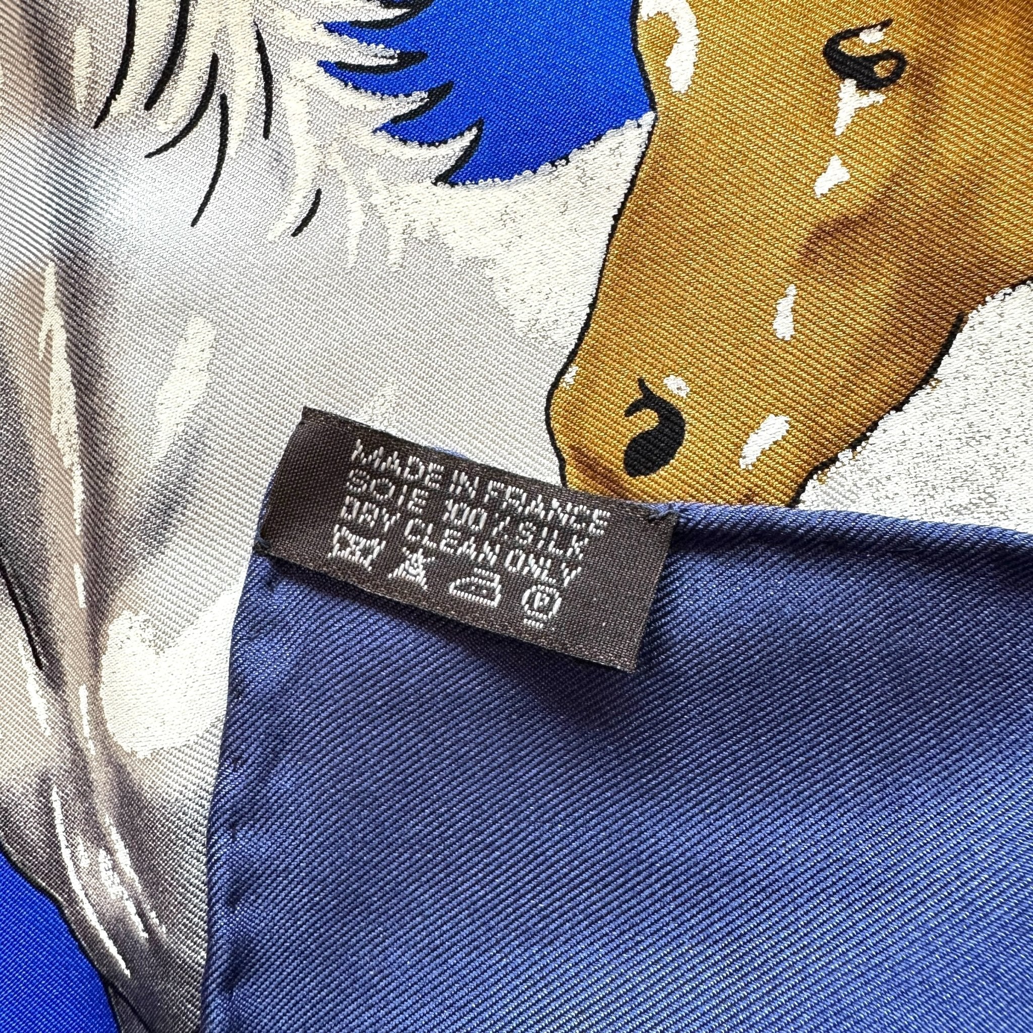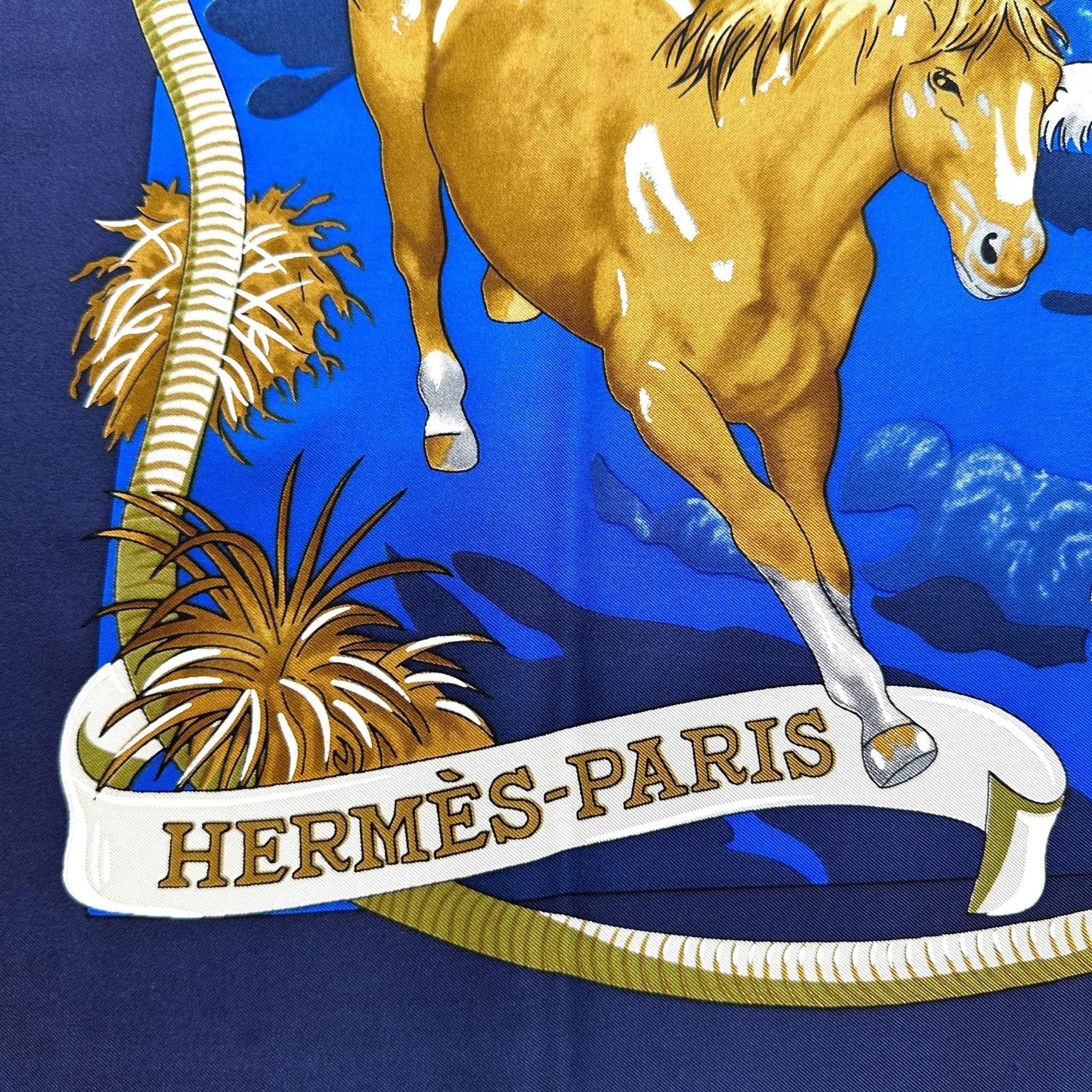 La composition est remarquable : un pelage blanc crème subtilement texturé sur les chevaux évoque une technique d'impression sophistiquée, propre à la Maison Hermès. La palette mêle bleu roi, marine, crème, marron et touches de blanc dans une scène d’une grande puissance visuelle. Le bleu roi est lumineux et sublime.